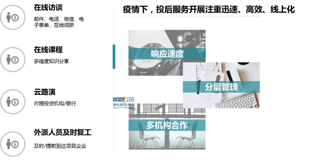在嚴(yán)格的物理隔離之下,機(jī)構(gòu)投后服務(wù)開(kāi)展注重高效化、線(xiàn)上化。通過(guò)在線(xiàn)訪(fǎng)談、電子表單等形式收集被投企業(yè)信息;通過(guò)線(xiàn)上課程解答眾多創(chuàng)業(yè)企業(yè)需要面對(duì)的共性問(wèn)題;原本線(xiàn)下進(jìn)行的資源對(duì)接會(huì)、路演也轉(zhuǎn)為了“云路演”,為企業(yè)高效對(duì)接資源。針對(duì)有外派人員的并購(gòu)類(lèi)、工程類(lèi)項(xiàng)目,外派人員及時(shí)甚至提前到崗,加快企業(yè)安全復(fù)工復(fù)產(chǎn)。