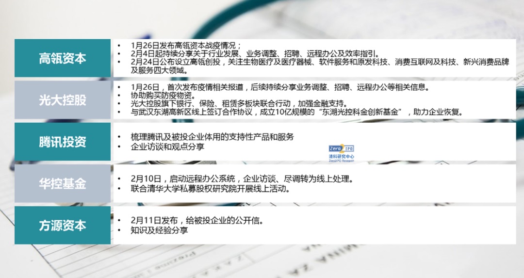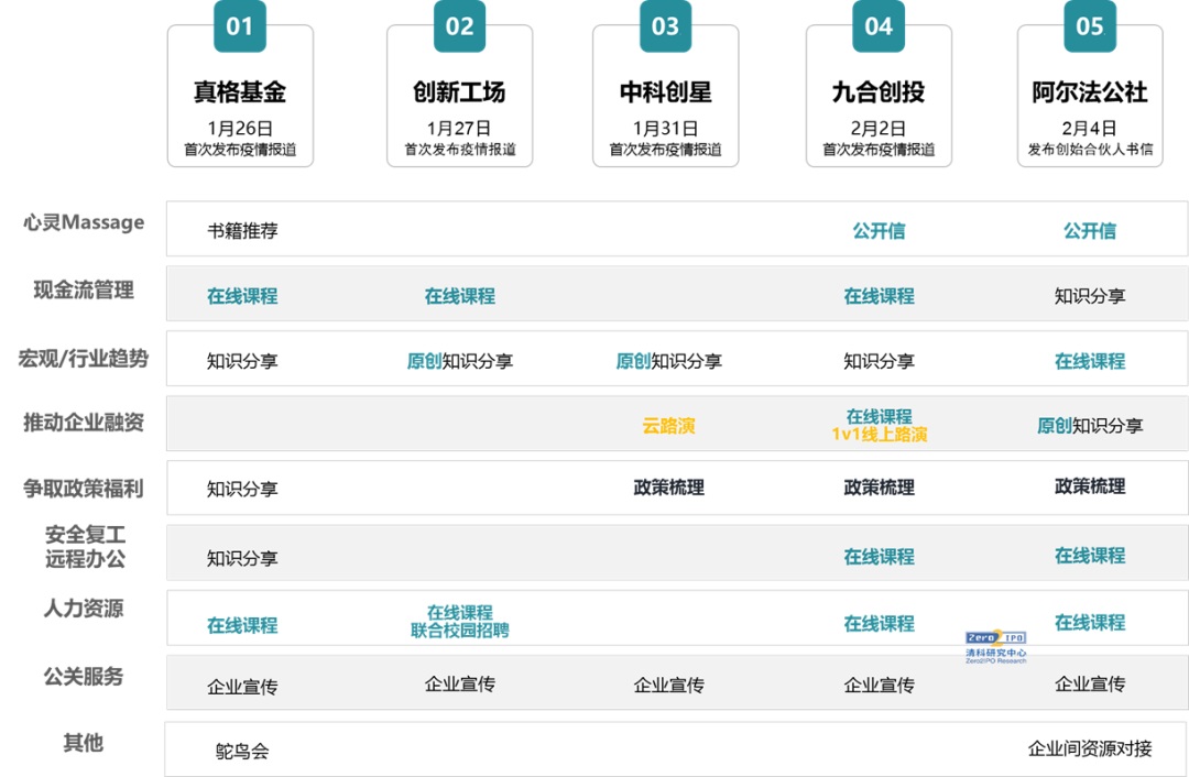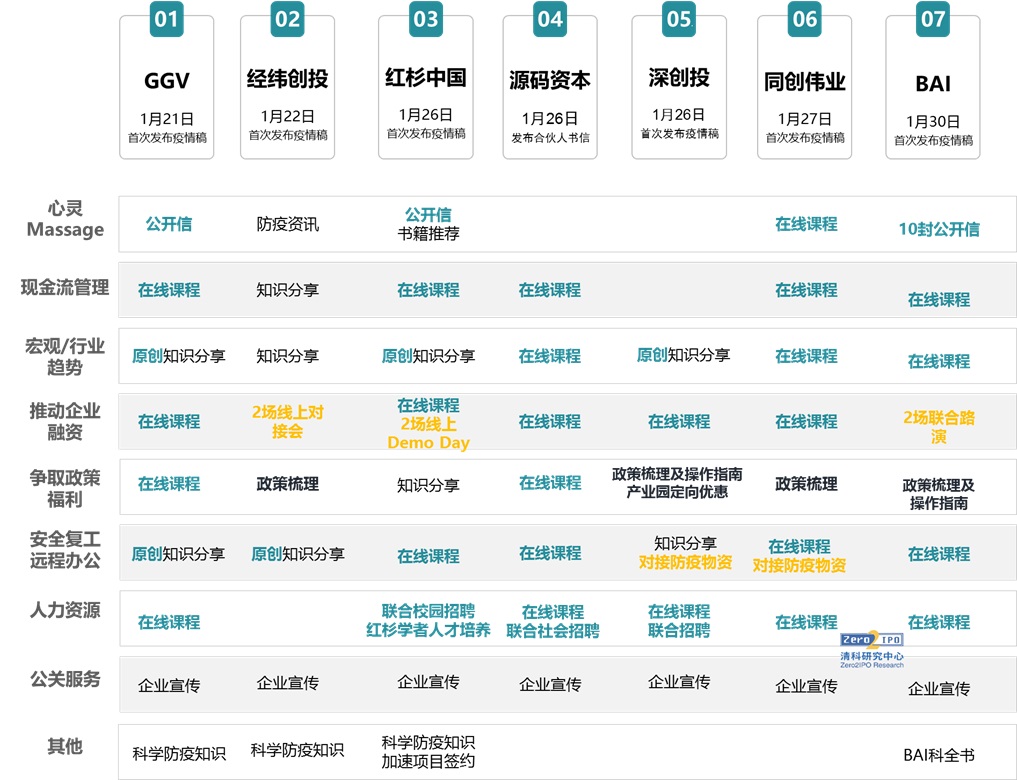 VC機(jī)構(gòu)是投后服務(wù)體系較為健全的一類(lèi)。面對(duì)突發(fā)狀況,VC機(jī)構(gòu)投后服務(wù)啟動(dòng)迅速,例如1月26日,紅杉中國(guó)即發(fā)布了《紅杉中國(guó)給成員企業(yè)的一封信》,發(fā)出對(duì)被投企業(yè)的三個(gè)提醒。紅杉、源碼資本、GGV等機(jī)構(gòu)均迅速開(kāi)展了系列課程,涵蓋遠(yuǎn)程辦公協(xié)作、勞動(dòng)法規(guī)培訓(xùn)、疫情時(shí)期的融資策略、疫情期間的財(cái)務(wù)風(fēng)險(xiǎn)管理以及疫情時(shí)期的人力資源優(yōu)化等方面。紅杉、經(jīng)緯、BAI率先嘗試了線(xiàn)上路演形式;紅杉、深創(chuàng)投、源碼資本幫助企業(yè)解決春招難題。