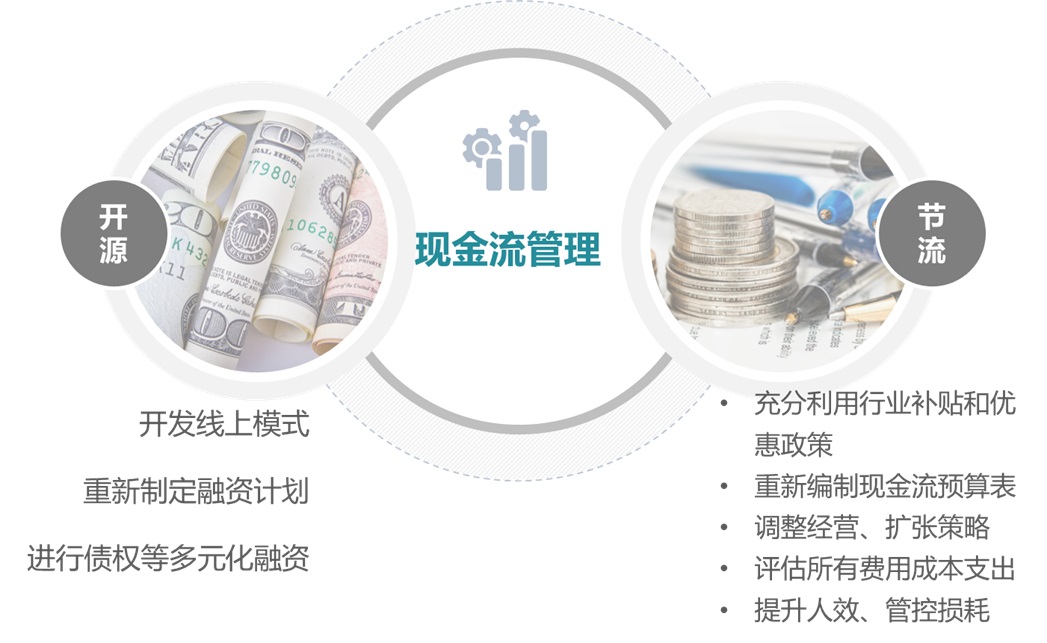 疫情之下,企業(yè)現(xiàn)金流出現(xiàn)危機(jī),“開(kāi)源節(jié)流”、“留足12個(gè)月運(yùn)營(yíng)資金”的呼聲不絕于耳。“開(kāi)源”方面,鼓勵(lì)企業(yè)跳出原有運(yùn)營(yíng)模式,評(píng)估打造線(xiàn)上產(chǎn)品的可能性,同時(shí)重新制定融資計(jì)劃,全面了解“股權(quán)”和“債權(quán)”融資方式,調(diào)整估值預(yù)期。“節(jié)流”方面,充分利用行業(yè)補(bǔ)貼和優(yōu)惠政策,例如延遲繳納社保等,及時(shí)調(diào)整經(jīng)營(yíng)策略,降低擴(kuò)張速度和補(bǔ)貼力度,編制未來(lái)一年現(xiàn)金流預(yù)期表,及時(shí)處理應(yīng)收應(yīng)付,評(píng)估銷(xiāo)售、薪酬、房租等費(fèi)用項(xiàng)目,制定合理降本計(jì)劃。