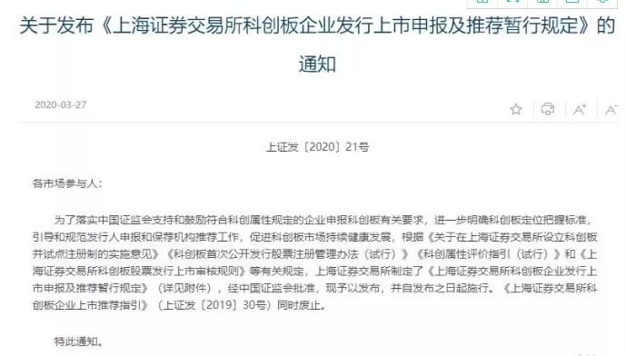 上海證券交易所科創(chuàng)板企業(yè)發(fā)行上市申報及推薦暫行規(guī)定