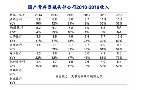 在骨科器械這一細分市場,國產器械則已經長期霸占市場。數據顯示,自2014年以來,頭部國產骨科公司有威高、納通、大博、愛康、凱利泰、春立,到2019年頭部骨科器械公司基本仍在頭部。其中,春立醫(yī)療(港股)股價更是實現了2年10倍幅。2019年,春立醫(yī)療收入為8.55億元,營業(yè)收入同比增長71.78%。春立醫(yī)療專注于骨科植入物市場,特別是關節(jié)類產品。